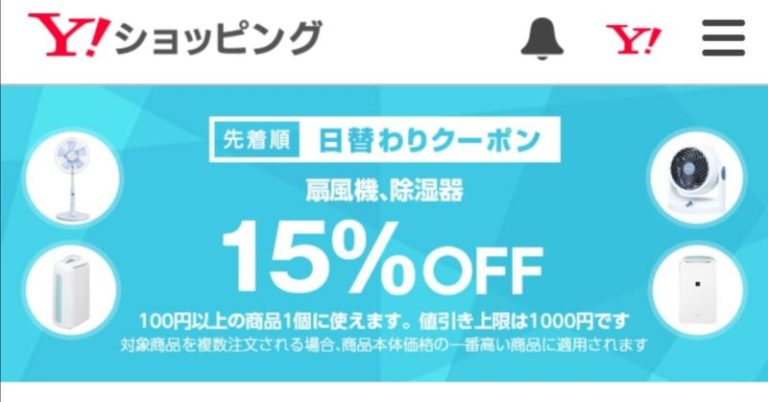 Yahoo!ショッピングにて【扇風機、除湿器カテゴリ商品対象】100円以上の商品1個で使える15%OFFクーポンが7月7日(火)限定で出現中。100円以上の商品1個に対して利用でき、値引き上限は1,000円ナリ。