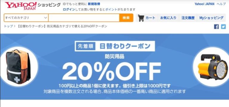 Yahoo!ショッピングで防災用品カテゴリ商品20%OFFの先着順 日替わりクーポンが出現中。防災用品カテゴリ商品の注文金額100円以上で値引き上限は1,000円。9月1日のみ使用可能ですが、先着順なのでご注意を!まずはクーポンをゲット!