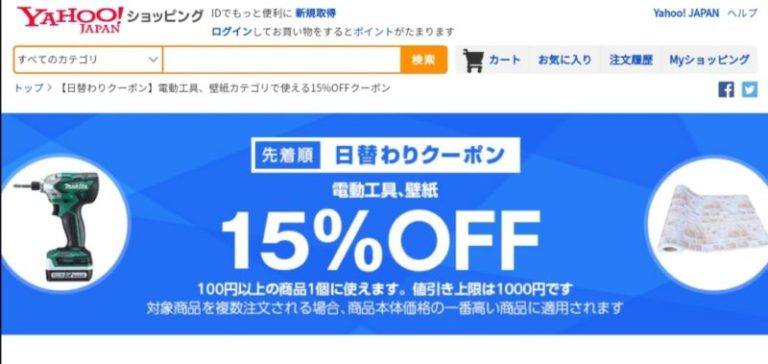 Yahoo!ショッピングで電動工具・壁紙用品カテゴリ15%OFFの先着順 日替わりクーポンが出現中。電動工具・壁紙用品カテゴリ商品の注文金額100円以上で値引き上限は1,000円。9月6日のみ使用可能ですが、先着順なのでご注意を!まずはクーポンをゲット!