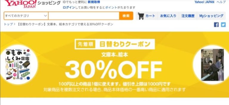 【終了】Yahoo!ショッピングで文庫本・絵本カテゴリ30%OFFの先着順 日替わりクーポンが出現中!(20/9/7限定)