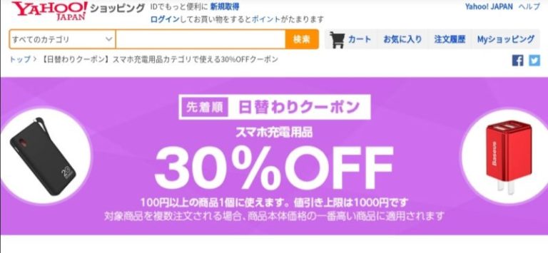 Yahoo!ショッピングでスマホ充電用品30%OFFの先着順 日替わりクーポンが出現中。スマホ充電用品カテゴリ商品で注文金額100円以上の商品1個が対象。値引き上限は1,000円。9月11日のみ使用可能ですが、先着順なのでご注意を!まずはクーポンをゲット!
