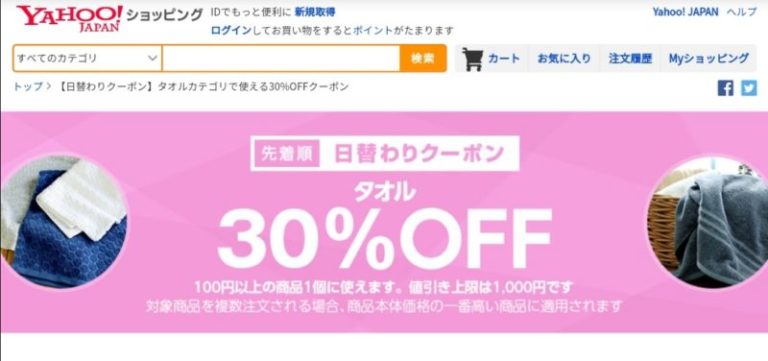 Yahoo!ショッピングでタオル30%OFFの先着順 日替わりクーポンが出現中。タオルカテゴリ商品で注文金額100円以上の商品1個が対象。値引き上限は1,000円。9月16日のみ使用可能ですが、先着順なのでご注意を!まずはクーポンをゲット!