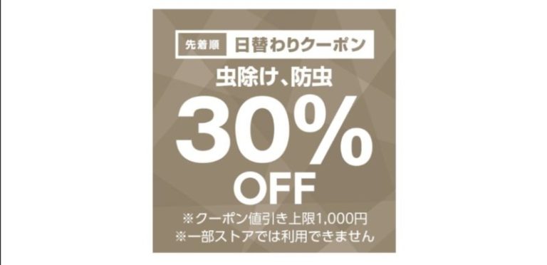 Yahoo!ショッピングで虫除け、防虫対象30%OFFの先着順 日替わりクーポンが出現中。虫除け、防虫カテゴリ商品対象で注文金額100円以上の商品1個が対象。値引き上限は1,000円。9月24日のみ使用可能ですが、先着順なのでご注意を!まずはクーポンをゲット!