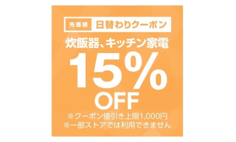 Yahoo!ショッピングで炊飯器、キッチン家電15%OFFの先着順 日替わりクーポンが出現中。炊飯器、キッチン家電カテゴリ商品対象で注文金額100円以上の商品1個が対象。値引き上限は1,000円。10月7日のみ使用可能ですが、先着順なのでご注意を!まずはクーポンをゲット!どんな商品があるのか、下記サイトより確認できます。