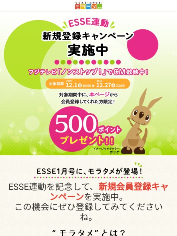 ESSE連動を記念して、新規会員登録キャンペーンを実施中。ESSE1月号にモラタメが登場するんですと。