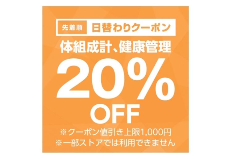 体組成計、健康管理カテゴリ商品対象で注文金額100円以上の商品1個が対象。値引き上限は1,000円。10月19日のみ使用可能ですが、先着順なのでご注意を!まずはクーポンをゲット!どんな商品があるのか、下記ページから確認できま~す。