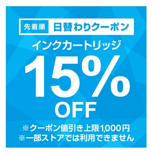 Yahoo!ショッピングでインクカートリッジ15%OFFの先着順 日替わりクーポンが出現中。インクカートリッジカテゴリ商品で注文金額100円以上の商品1個が対象。値引き上限は1,000円。4月20日のみ使用可能ですが、先着順なのでご注意を!まずはクーポンをゲット!
