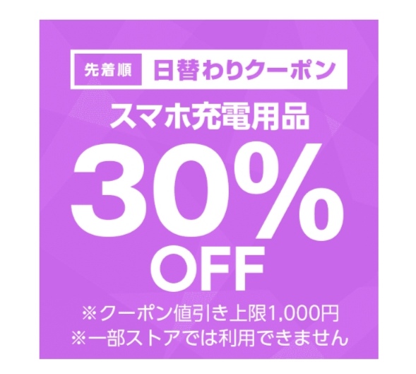 Yahoo!ショッピングでスマホ充電用品30%OFFの先着順 日替わりクーポンが出現中。スマホ充電用品カテゴリ商品で注文金額100円以上の商品1個が対象。値引き上限は1,000円。11月11日のみ使用可能ですが、先着順なのでご注意を!まずはクーポンをゲット!