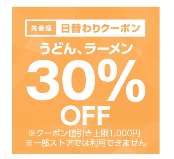 うどん、ラーメンカテゴリ商品対象で注文金額100円以上の商品1個が対象。値引き上限は1,000円。11月21日のみ使用可能ですが、先着順なのでご注意を!まずはクーポンをゲット!