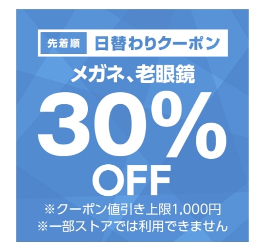 メガネ、老眼鏡カテゴリ商品対象で注文金額100円以上の商品1個が対象。値引き上限は1,000円。11月23日のみ使用可能ですが、先着順なのでご注意を!まずはクーポンをゲット!