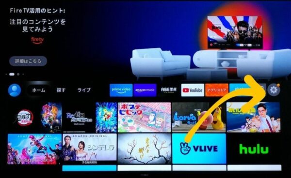 Amazon Fire TVのホーム画面中央右端の歯車ボタンをクリック