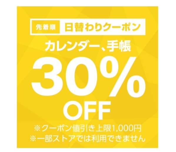 カレンダー、手帳カテゴリ商品対象で注文金額100円以上の商品1個が対象。値引き上限は1,000円。11月28日のみ使用可能ですが、先着順なのでご注意を!まずはクーポンをゲット!