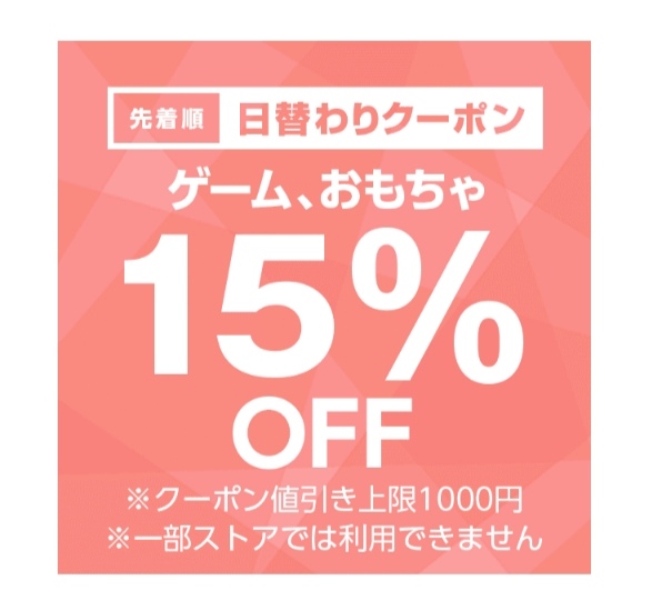 ゲーム、おもちゃカテゴリ対象で注文金額100円以上の商品1個が対象。値引き上限は1,000円。12月8日のみ使用可能ですが、先着順なのでご注意を!まずはクーポンをゲット!どんな商品があるのか、下記サイトより確認できます。