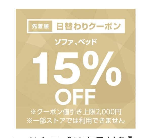 ソファ、ベッドカテゴリカテゴリ商品対象で注文金額100円以上の商品1個が対象。値引き上限は2,000円。12月17日のみ使用可能ですが、先着順なのでご注意を!まずはクーポンをゲット!どんな商品があるのか、下記サイトより確認できます。