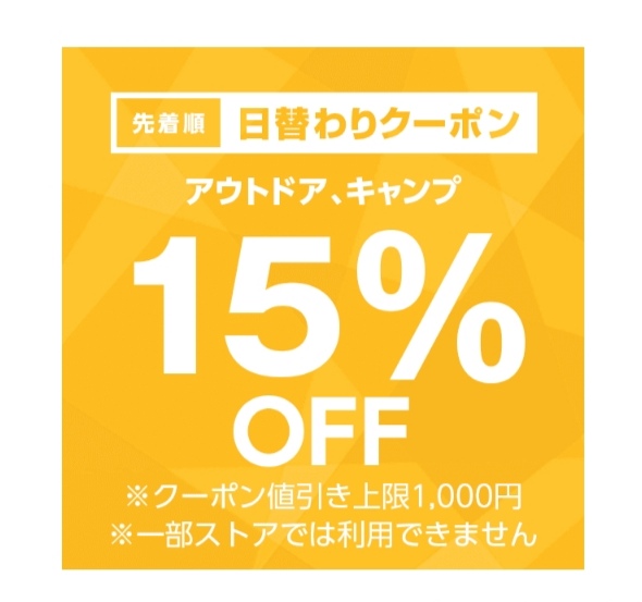 アウトドア、キャンプカテゴリ商品対象で注文金額100円以上の商品1個が対象。値引き上限は1,000円。12月19日のみ使用可能ですが、先着順なのでご注意を!まずはクーポンをゲット!どんな商品があるのか、下記サイトより確認できます。