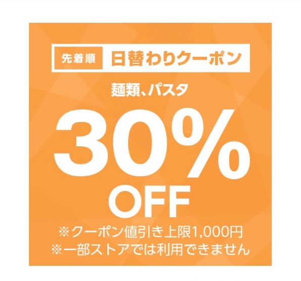 麺類、パスタカテゴリ商品対象で注文金額100円以上の商品1個が対象。値引き上限は1,000円。12月20日のみ使用可能ですが、先着順なのでご注意を!まずはクーポンをゲット!どんな商品があるのか、下記サイトより確認できます。