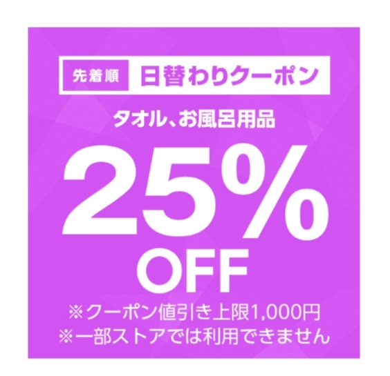 タオル、お風呂用品対象で注文金額100円以上の商品1個が対象。値引き上限は1,000円。12月25日のみ使用可能ですが、先着順なのでご注意を!まずはクーポンをゲット!どんな商品があるのか、下記サイトより確認できます。