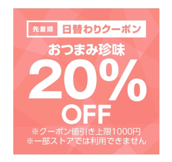 おつまみ珍味カテゴリ商品対象で注文金額100円以上の商品1個が対象。値引き上限は1,000円。12月29日のみ使用可能ですが、先着順なのでご注意を!まずはクーポンをゲット!どんな商品があるのか、下記サイトより確認できます。