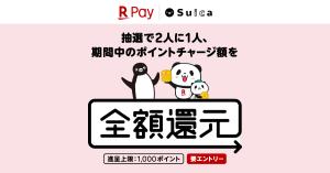 ②期間中に楽天ペイのSuicaで楽天ポイントチャージ合計額に対して2人に1人抽選で全額還元。上限1,000ポイント。