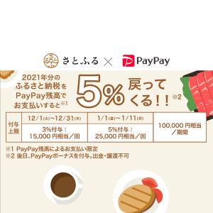さとふるのふるさと納税をPayPayオンライン決済にてPayPay残高払いで支払うと、12月1日~31日は3%戻ってくる。1月1日~11日は5%戻ってくる!