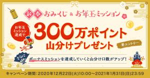 キャンペーンにエントリー&新春おみくじを引いたうえ、お年玉ミッション(山分けミッション)を達成すると300万ポイントを山分けでプレゼント。ボーナスミッションを達成すると、達成数に応じて山分け口数がアップ。
