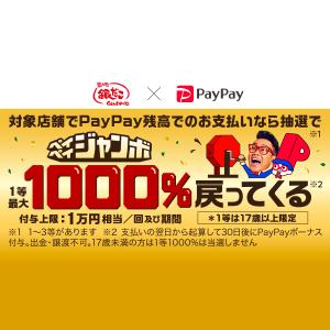 対象ストアでPayPay残高払いでの決済を利用すると抽選でき、1等~3等が当たると1,000%~5%還元。5回に1回の確率でいずれかが当たる!※付与上限10,000円相当/1回・期間