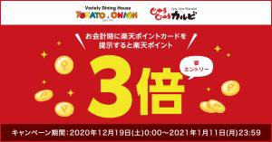 キャンペーンにエントリーのうえ、「トマトアンドオニオン」「じゅうじゅうカルビ」で楽天ポイントカードまたは楽天ポイントカードアプリを提示して会計をすると通常の3倍のポイントを進呈。※進呈上限10,000円pt