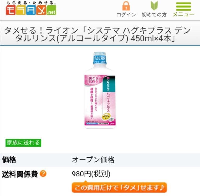 モラタメ ライオン「システマ ハグキプラス デンタルリンス(アルコールタイプ) 450ml×4本」が980円(税別・送料込)でタメせる