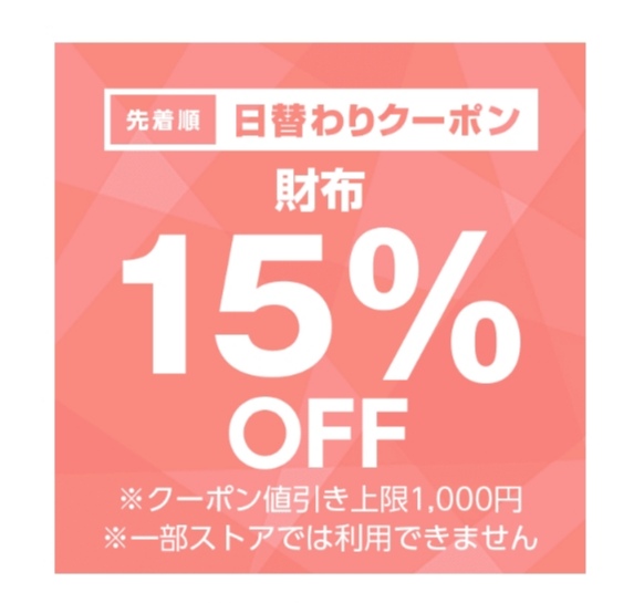 財布カテゴリ商品対象で注文金額100円以上の商品1個が対象。値引き上限は1,000円。1月1日のみ使用可能ですが、先着順なのでご注意を!まずはクーポンをゲット!