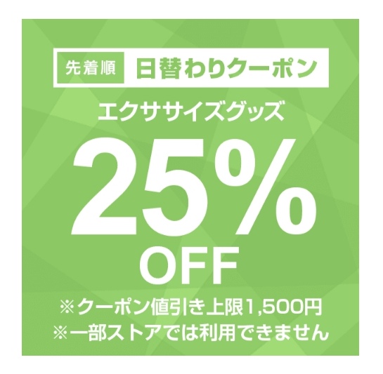 25%OFFで値引上限高めの1,500円!ヨガマット、バランスボール、フェイスマスク、振動マシン、フィットネスバイク、なわとび、ダンベル、トレーニングシューズなどがありますよ~!