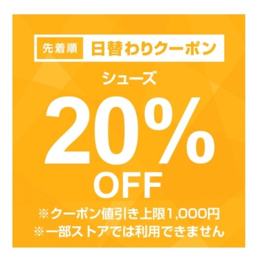 シューズカテゴリ対象で注文金額100円以上の商品1個が対象。値引き上限は1,000円。1月16日のみ使用可能ですが、先着順なのでご注意を!まずはクーポンをゲット!どんな商品があるのか、下記サイトより確認できます。