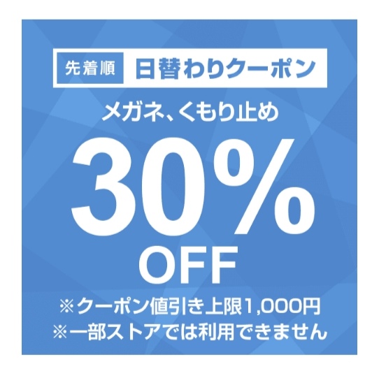 メガネ、くもり止めカテゴリ商品対象で注文金額100円以上の商品1個が対象。値引き上限は1,000円。1月17日のみ使用可能ですが、先着順なのでご注意を!まずはクーポンをゲット!どんな商品があるのか、下記サイトより確認できます。