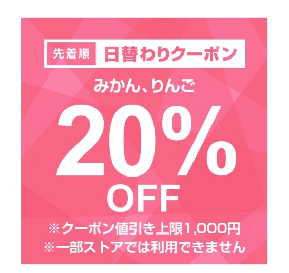 みかん、りんごカテゴリ商品対象で注文金額100円以上の商品1個が対象。値引き上限は1,000円。1月22日のみ使用可能ですが、先着順なのでご注意を!まずはクーポンをゲット!どんな商品があるのか、下記サイトより確認できます。