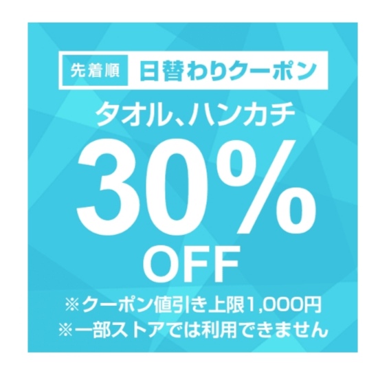 タオル、ハンカチ用品カテゴリ商品対象で注文金額100円以上の商品1個が対象。値引き上限は1,000円。2月28日のみ使用可能ですが、先着順なのでご注意を!まずはクーポンをゲット!どんな商品があるのか、下記サイトより確認できます。