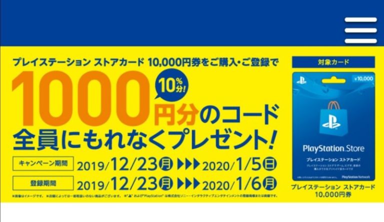 プレイステーション ストアカード10,000円券を購入し特設サイトから登録すると購入額の10%分となる1,000円分のコードがもらえます