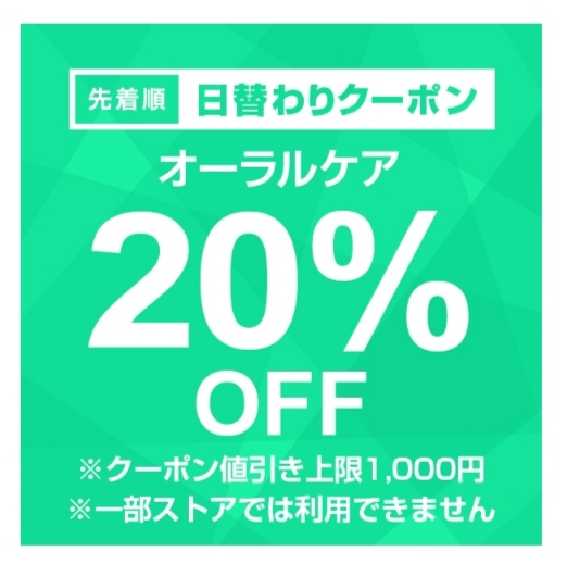 オーラルケアカテゴリ商品対象で注文金額100円以上の商品1個が対象。値引き上限は1,000円。2月24日のみ使用可能ですが、先着順なのでご注意を!まずはクーポンをゲット!どんな商品があるのか、下記サイトより確認できます。