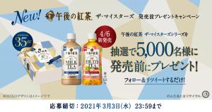 キリンビバレッジ♪Twitterアカウント(@Kirin_Company)フォローし、キャンペーンツイートをリツイートまたは引用リツイートするとリニューアルする午後の紅茶3種セットBOXが抽選で5,000名に当たりますよ~!