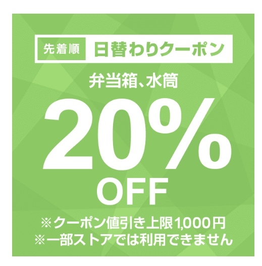 弁当箱、水筒カテゴリ商品対象で注文金額100円以上の商品1個が対象。値引き上限は1,000円。3月4日のみ使用可能ですが、先着順なのでご注意を!まずはクーポンをゲット!どんな商品があるのか、下記サイトより確認できます。