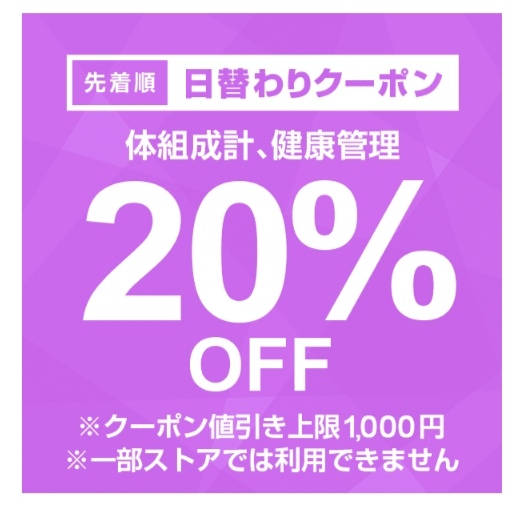 体組成計、健康管理カテゴリ商品対象で注文金額100円以上の商品1個が対象。値引き上限は1,000円。3月5日のみ使用可能ですが、先着順なのでご注意を!まずはクーポンをゲット!どんな商品があるのか、下記ページから確認できま~す。