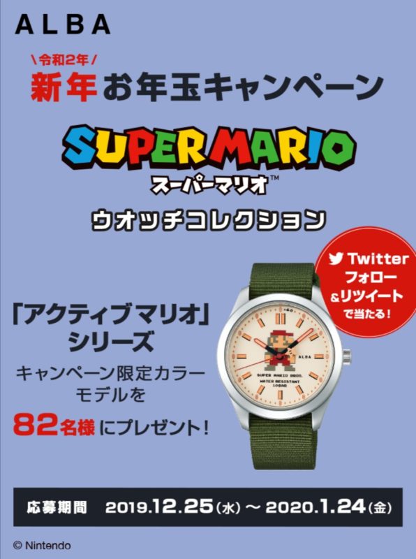 ALBA 新年お年玉キャンペーン スーパーマリオウォッチコレクション「アクティブマリオ」シリーズ 限定カラーモデルが82名に当たる(1/24 17:59まで)