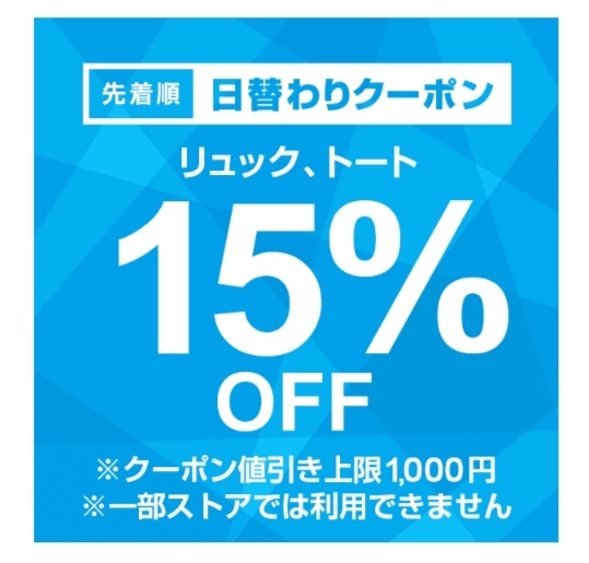 Yahoo!ショッピングでリュック、トート15%OFFの先着順 日替わりクーポンが出現中。リュック、トートカテゴリ商品で注文金額100円以上の商品1個が対象。値引き上限は1,000円。3月24日のみ使用可能ですが、先着順なのでご注意を!まずはクーポンをゲット!
