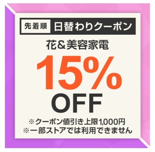 Yahoo!ショッピングで花と美容家電15%OFFの先着順 日替わりクーポンが出現中。花と美容家電カテゴリ商品対象で注文金額100円以上の商品1個が対象。値引き上限は1,000円。4月17日のみ使用可能ですが、先着順なのでご注意を!まずはクーポンをゲット!