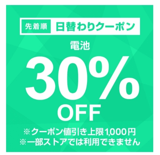 Yahoo!ショッピングで電池30%OFFの先着順 日替わりクーポンが出現中。電池カテゴリ商品対象で注文金額100円以上の商品1個が対象。値引き上限は1,000円。5月15日のみ使用可能ですが、先着順なのでご注意を!まずはクーポンをゲット!