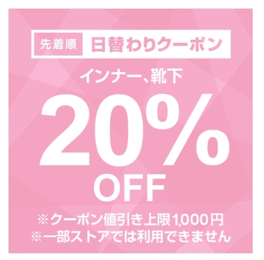 インナー、靴下カテゴリ商品対象で注文金額100円以上の商品1個が対象。値引き上限は1,000円。5月25日のみ使用可能ですが、先着順なのでご注意を!まずはクーポンをゲット!