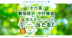 アサヒ飲料公式Twitterアカウント(@asahiinryo_jp)をフォローし、公式アカウントの「#十六茶」「#十六茶夏編CM公開」がついた投稿をリツイートすると、「十六茶」新垣結衣さん・中村倫也さんポスター(1枚ずつ計2枚)が抽選で100名に当たりますよ~。