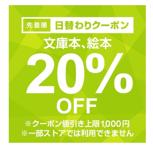 Yahoo!ショッピングで文庫本、絵本20%OFFの先着順 日替わりクーポンが出現中。文庫本、絵本カテゴリ商品で注文金額100円以上の商品1個が対象。値引き上限は1,000円。6月3日のみ使用可能ですが、先着順なのでご注意を!まずはクーポンをゲット!