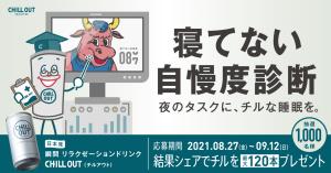 キャンペーンサイトで「寝てない自慢度診断」を受け、診断結果を自分のTwitterにシェア&CHILLOUT公式Twitterアカウント(@chillout_01)をフォローすると、CHILL OUT最大120缶が合計1,000名に当たりますよ~。