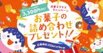 キャンペーンページにてとても簡単クイズ3問に答えて、必要事項を入力のうえ応募すると国内メーカーのお菓子詰めあわせ3,300円相当が3,300名に当たりますよ~。