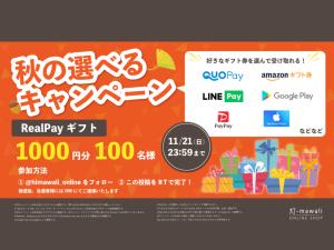 灯-mawali ONLINE SHOPの公式Twitterアカウント(@himawali_online)をフォロー&対象ツイートをリツイートするとRealPayギフトコード1,000円分が抽選で100名に当たりますよ~。
