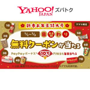 Yahoo!ズバトク「新春お年玉特大号【1週間限定】日替わり無料クーポンが当たるキャンペーン 無料クーポンに加えてPayPayボーナス10万円相当も毎日当たる」